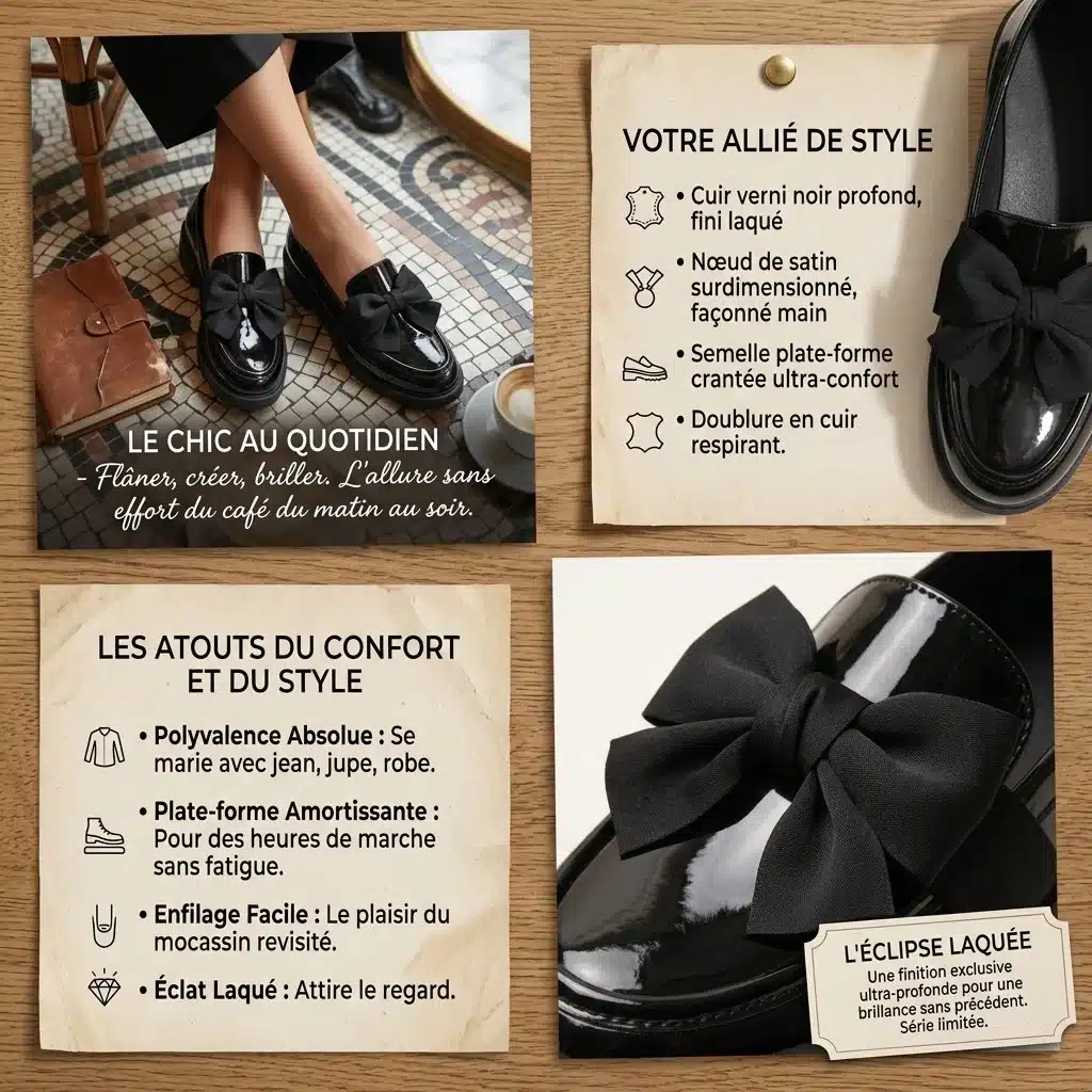 infographie de 4 images pour le produit mocassin femme noire laquée. Première image représentant le produit en action, la seconde les caractéristiques, la troisième les bénéfices du produits et la dernière la présentation du produit.