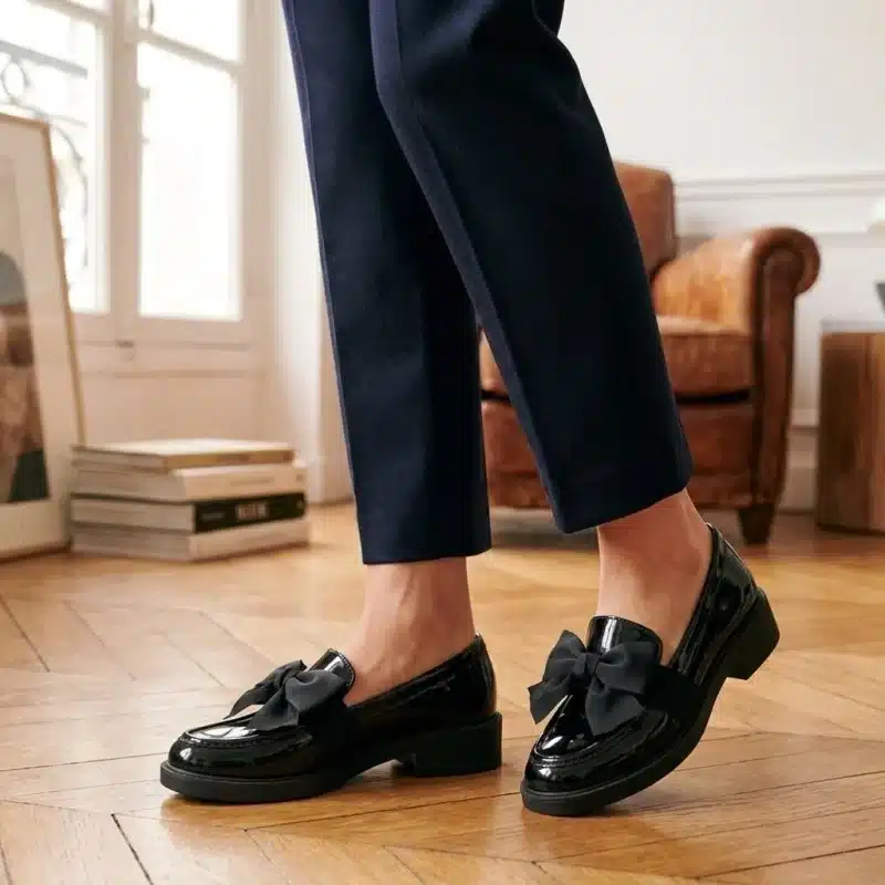 Le mocassin femme noir laqué avec nœud élégant : la chaussure chic et confortable qui sublime vos tenues du quotidien.