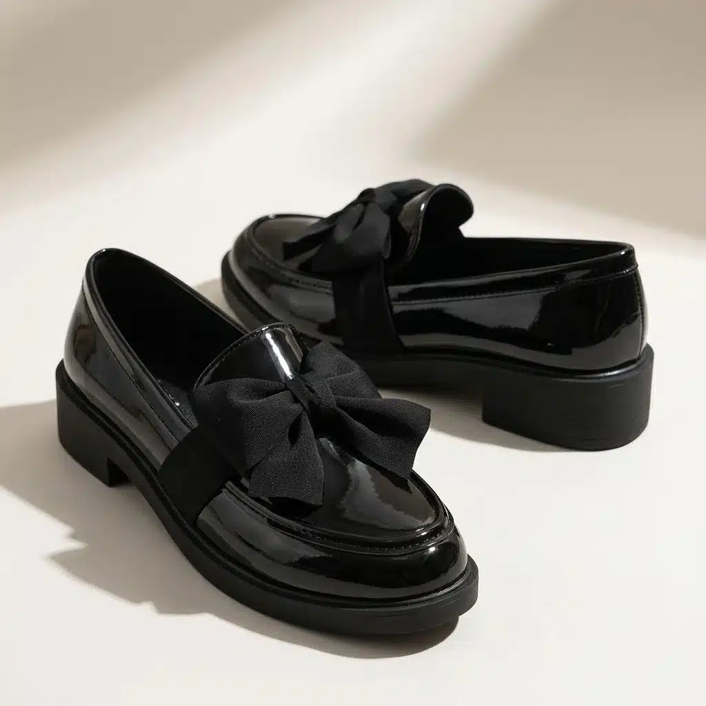Une paire de mocassins pour femme en cuir verni noir brillant, posée sur une surface de studio claire. Chaque chaussure est ornée d'un grand nœud décoratif en tissu noir mat sur le devant. Elles ont des semelles épaisses et crantées en caoutchouc noir. L'éclairage doux de studio crée des reflets nets sur le cuir verni et des ombres diffuses en arrière-plan.